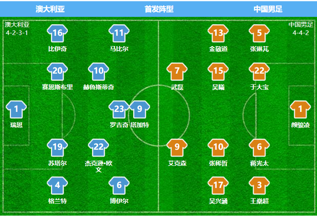 然而,在首发球员的选配上,尤其是后卫线上的人员调整,无疑引发了外界的诸多疑惑。由于唐淼的受伤缺阵,李铁本场比赛选用于大宝和蒋光太组成全新的中后卫组合,张琳芃则拉到右后卫填补唐淼的缺阵。中前场李铁沿用了40强赛首发人员配置,艾克森搭档武磊出任首发前锋,吴曦、张稀哲、金敬道、吴兴涵组成中场4人组。