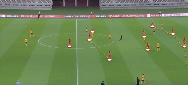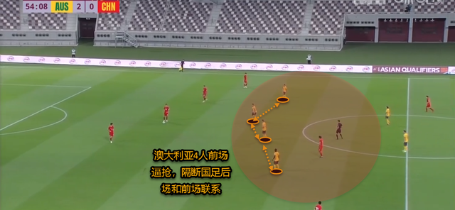 上图中,可以看到澳大利亚队在国足后卫线前,形成4名进攻球员的高位压迫,这让国足后卫线出球异常困难。同时国足后腰位置上张稀哲身体上劣势,很难在和澳大利亚球员对抗中占据上风,因此也导致了国足进攻受阻,只能凭借后场长传发动简单反击,很显然这样的进攻正中澳大利亚队的下怀。