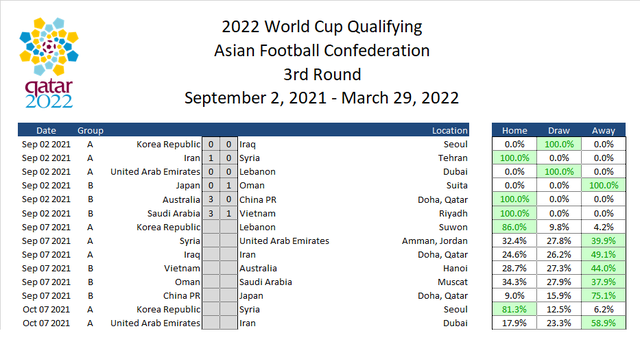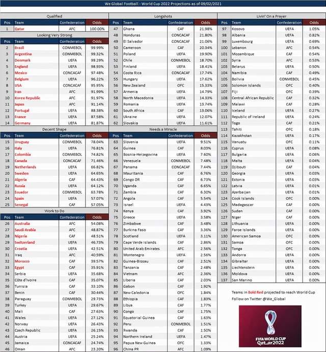 赛后,数据机构We Global Football针对亚洲12支球队发布了出线概率预测。