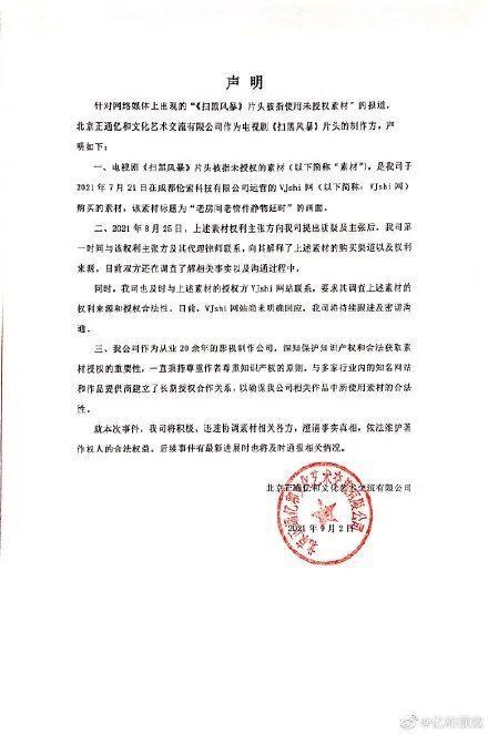 9月2日,该剧片头的制作公司发布声明表示,相关素材是从成都一公司运营的VJshi网购买,已就此事与对方联系。对此,王先生回应称,从未上传任何视频到该网站。
