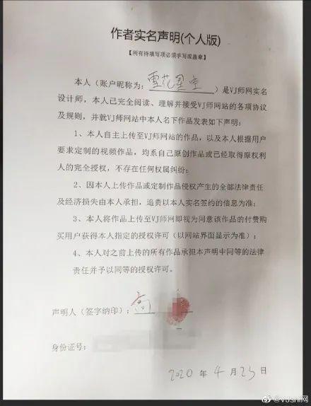 @VJshi网 发布道歉声明称,供稿人高某某提供了非原创作品,已对其账号进行封禁,并终止合作。VJshi网对本次事件涉及的权利人、相关方表示道歉。目前正与各方积极沟通,会承担应有责任。