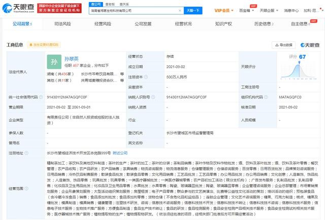 天眼查App显示,9月2日,湖南省湘茗生物科技有限公司成立,法定代表人为孙翠英,注册资本500万人民币,经营范围包括茶饮料及其他饮料制造;农产品收购;农产品研发;食品的研发;食品检测服务等,股东信息显示,该公司由湖南茶悦文化产业发展集团有限公司全资持股。