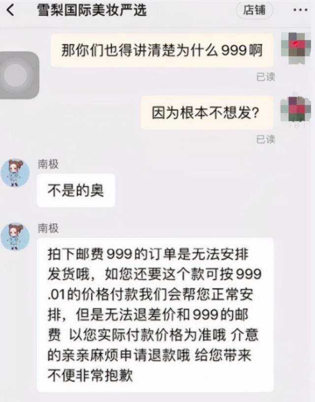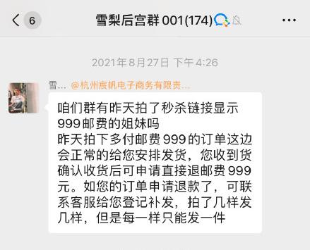 值得注意的是,该说法与此前客服给出的回应不一致。此前,有消费者在拍下秒杀商品当天联系雪梨店铺,并从客服获悉,石家庄为不发货地区,邮费999元的订单是无法安排发货的,如果需要该商品,那么支付999.01元邮费才能正常安排发货,如果介意可以申请退款。