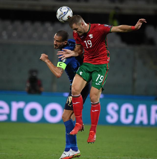 9月2日,意大利队球员博努奇(左)与保加利亚队球员伊利耶夫争顶。新华社发(阿尔贝托·林格利亚摄)