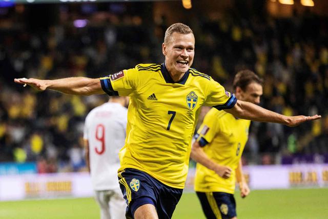 9月2日,瑞典队球员克莱松庆祝进球。新华社/法新