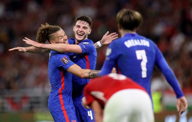 9月2日,英格兰队球员赖斯(中)进球后和队友菲利普斯(左)庆祝。新华社/路透