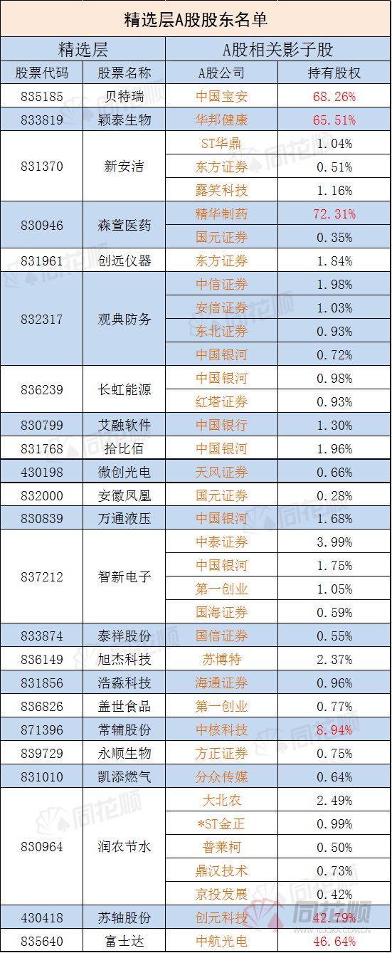 据同花顺数据统计,目前66家精选层企业,30家A股上市公司以直接或者间接的方式参与投资,包括子公司间接投资等,其中券商占据半壁江山。
