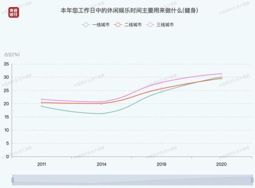 从不同城市类型来看,近十年来,三线城市对运动健身的热衷程度,已经超过一、二线城市。