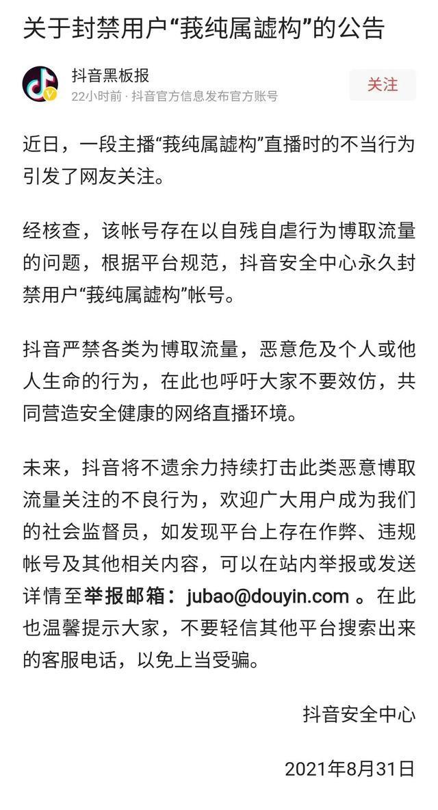 对此,“抖音黑板报”官方头条号发布关于封禁“莪纯属譃构”的公告。