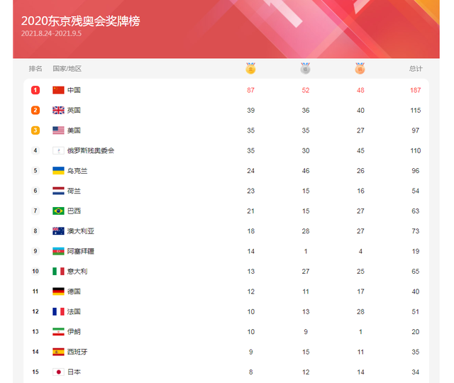 东京残奥会第10个比赛日(9月3日)中国代表队单日再拿8金,目前以87金52银48铜,合计187枚奖牌稳稳排在奖牌榜第一位!美国队落后一大截,以35金35银27铜排在第三位!