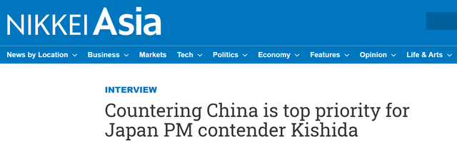 【环球网报道】被日媒普遍视为“自民党新总裁”有力竞争者的岸田文雄为了造势,也开始喊着要“对付中国”了。据《日经亚洲评论》9月4日最新消息称,岸田文雄接受其采访时宣称,他对中国在外交和经济方面的强硬行为“深感震惊”,“对付中国”将是其政府“首要任务”。