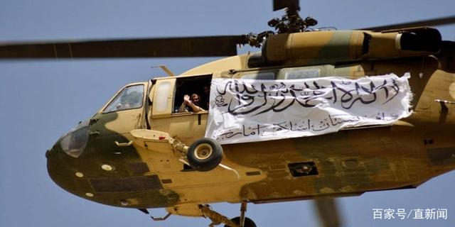 光有美式装备的地面部队还不够,塔利班还组织了一次空中表演,一架最近缴获的黑鹰直升机从上空飞过,拖着一面塔利班的白色旗帜。
