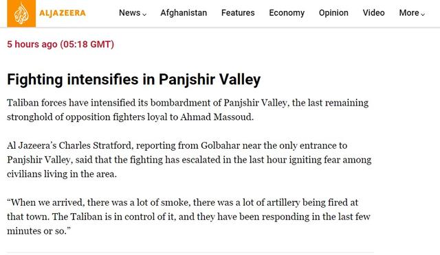 据半岛电视台最新消息,塔利班部队加强了对潘杰希尔山谷的轰炸,半岛电视台的记者在潘杰希尔山谷唯一入口附近的戈尔巴哈尔报道说,战斗在最后一个小时升级,点燃了生活在该地区平民的恐惧。