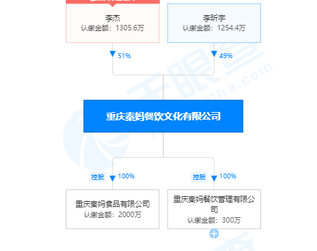 天眼查APP显示,作为秦妈实业集团的旗舰,重庆秦妈餐饮文化有限公司成立于2001年8月3日,注册地在重庆市渝北区回兴街道宝环二路1号3幢一层 ,现法定代表人为李杰(秦远红丈夫),经营范围包括一般项目:餐饮文化推广、餐饮管理,注册资本2560万元,股东分别为李杰占51%、李昕宇占49%。