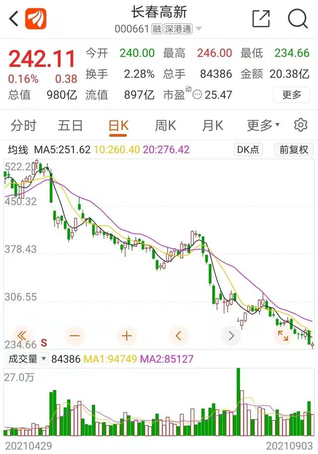 爆仓故事所涉及的长春高新是医药行业里的一只传统明星股,是国内生长激素龙头企业。今年5月下旬以来,长春高新股价一路下跌,8月初,有媒体报道增高针滥用风险,引发其股价的进一步下挫。该公司半年报净利润19.23亿元,同比增长近47%,却也未能扭转股价颓势。最新收报242.11元/股,较年内高点回落53%。