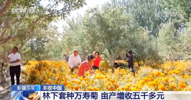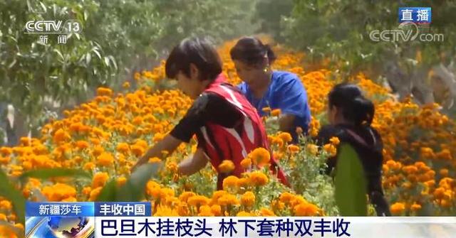 一开始大家看到的这个橘色的花叫万寿菊,是提取叶黄素的主要原料,主要应用在食品、医药、保健等方面。在这块地里,现在不仅实现了巴旦木丰收,同时也是万寿菊采摘的时节,之所以选择万寿菊作为套种经济作物,一方面矮秆作物通风透光性好,另一方面它基本不与巴旦木争营养。当地农民依托林下套种的方式也拓宽了增收渠道,所以您看一亩地三分巴旦木七分万寿菊,农民每亩地一年的纯收入在5000多块钱左右。