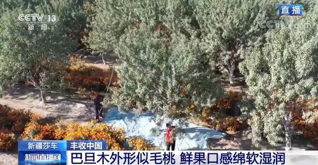 总台记者 刘菲:这里就是一个种植面积有1000多亩的巴旦木果园。从镜头中您看我是置身在一片橘色的花海中,这究竟是什么植物?做什么用呢?稍候的直播中,我来为大家揭晓答案。我身旁这一排树都是巴旦木树,树龄短的三五年,最长的有三十多年,由于枝繁叶茂,一眼看不到巴旦木在哪里。从外观上看巴旦木有点像毛桃,但不同的是,毛桃吃果肉,巴旦木吃的是果核,剥开青皮就能看到新鲜的巴旦木,外观看起来跟咱们吃的干果一样。刚从树上摘下来的巴旦木口感比较绵软湿润,没有那么脆,但是越嚼越香,难怪当地人最推荐的就是原味巴旦木。