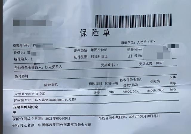 彭大妈的儿子也是充满疑惑地拿过母亲手里的“存单”,仔细一看这才发现,这哪里是存单,明明就是一份保险单。彭大妈的儿子认为母亲是被工作人员“忽悠”了,便与母亲一同前往银行,找工作人员理论。