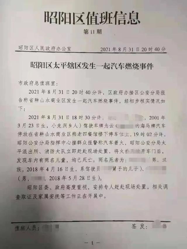 当晚7时02分许,昭阳区公安分局指挥中心接到群众关于该轿车着火燃烧的报警后,该分局太平派出所、昭阳区消防救援大队立即赶赴现场救援,将现场大火扑灭并破开车门后,发现车内两名儿童均已死亡,两名遇难儿童分别是司机的儿子和司机舅子的儿子,年龄分别为3岁零2个月、3岁零4个月。