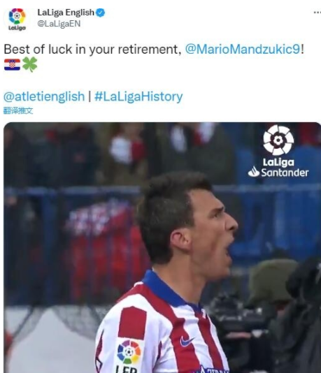 “曼朱基奇,祝挂靴一切顺利。”西甲官方写道,文字下面,配的是曼朱基奇身穿马竞球衣庆祝进球的照片。