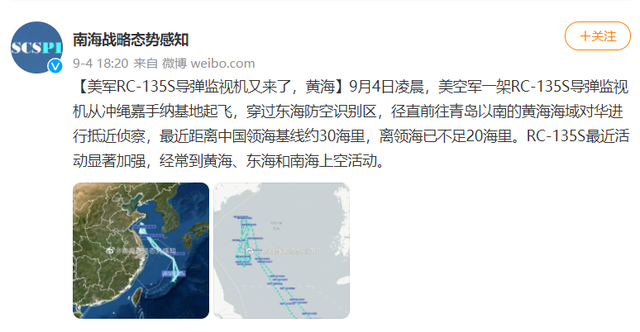 “南海战略态势感知”智库官方微博发布消息称,9月4日凌晨,美空军一架RC-135S导弹监视机从冲绳嘉手纳基地起飞,穿过东海防空识别区,径直前往青岛以南的黄海海域对华进行抵近侦察,最近距离中国领海基线约30海里,离领海已不足20海里。RC-135S最近活动显著加强,经常到黄海、东海和南海上空活动。