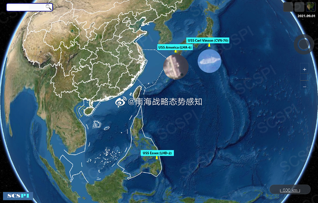 南海战略态势感知官方微博号9月1日发布消息称,日前,美军向西太地区增派的“卡尔·文森”号航母打击群和“埃塞克斯”号两栖戒备群已陆续到位,结束了自6月18日“里根”号航母离开南海以来西太陷入的美军航母“真空”状态。此外,“美国”号两栖攻击舰也在西太平洋。南海战略态势感知综合AIS信号和卫星影像,绘制出了美军大型水面平台的9月1日的位置。