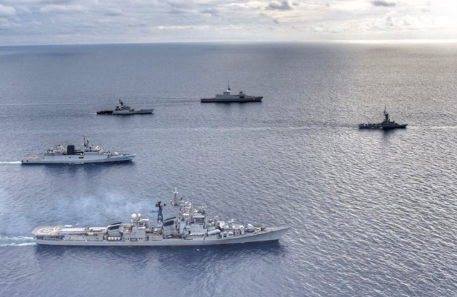 印度海军目前有4艘舰艇在南海地区巡航,分别为拉杰普特级导弹驱逐舰“兰维杰”号、施瓦里克级导弹护卫舰“施瓦里克”号、格莫尔达级反潜护卫舰“卡德玛特”号、科拉级小型护卫舰“科拉”号。这些护卫舰9月4日同新加坡海军参加了联合演习。