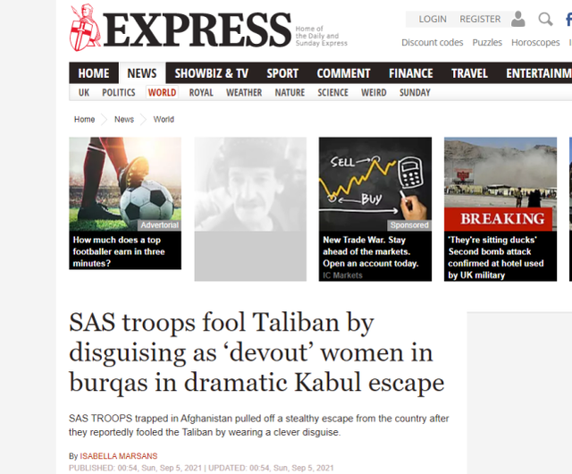 来自英国军事部门的一名消息人士称:“这支队伍已经在阿富汗待了几个月,当大家都因失败撤离时,他们正在执行一项秘密侦查任务。随后,他们购买了5辆车,驱车前往喀布尔,一进首都,这些英军就丢弃了除武器和弹药之外的大部分装备,并穿上罩袍扮成阿富汗女性,躲在人群中。”