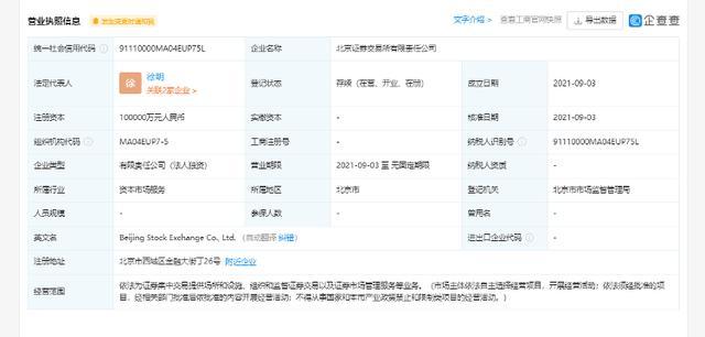 9月5日,记者注意到,北京证券交易所有限责任公司已完成工商注册,成立日期为9月3日,注册资本为10亿元,法定代表人为徐明。