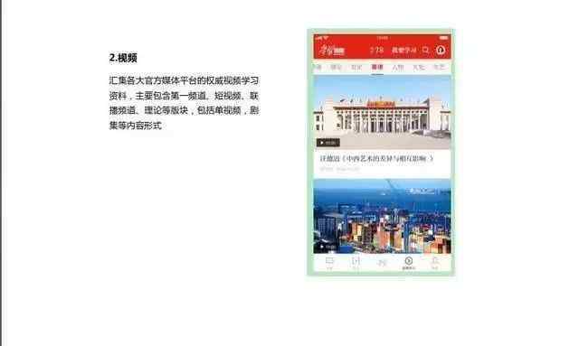 在“视频学习”板块,有第一视频、短视频、联播频道、理论、党史、海量开放在线课程、人物、文化、文艺、科学、自然、电视剧、电影、法治、军事等频道。“第一视频”主要是关于习近平总书记相关活动的视频报道。顾名思义,“联播频道”就是央视新闻联播视频。海量开放在线课程是一个免费的公共视频课程,种类繁多。