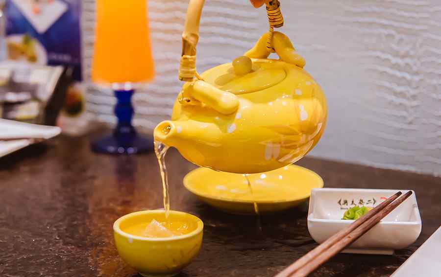松茸汤|强烈推荐,松茸汤是用小茶壶盛的热菜。趁热喝,汤味道鲜甜香浓,汤底还有三文鱼、红虾、松茸等多种食材,是很好的滋补品。