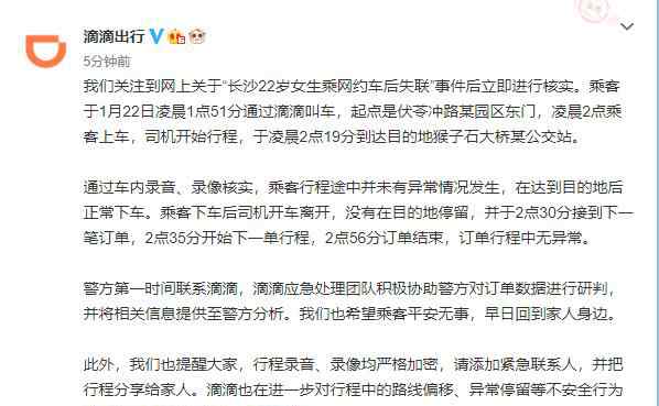 @滴滴出行微博1月23日称,我们关注到网上关于“长沙22岁女生乘网约车后失联”事件后立即进行核实。乘客于1月22日凌晨1点51分通过滴滴叫车,起点是伏苓冲路某园区东门,凌晨2点乘客上车,司机开始行程,于凌晨2点19分到达目的地猴子石大桥某公交站。