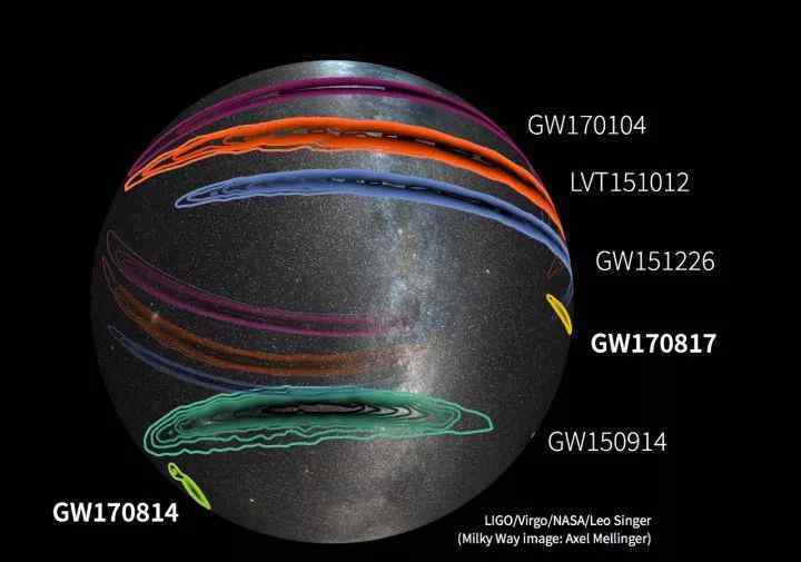 到目前为止,已经观察到六次引力波事件。图中不同颜色的圆圈代表引力波事件信号可能来自天空的方向范围。几次引力波事件后,通过引力波观测可以给出事件在天空的可能位置分布对比。可见今年加入欧洲处女座后,三站给出的定位精度有了很大提高。图片来源:LIGO/处女座/美国宇航局/利奥·辛格/阿克塞尔·梅林格