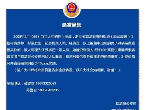 2008年2月10日凌晨(元旦第四天),浙江省德清县舞阳街(原武康镇)上白村黄前岭村路发生恶性杀人案。经调查,以上视频中的男子对破案有很大价值,可能是江苏宿迁人。如果能指认此人或提供本案重要线索,请立即联系德清县公安局刑侦大队。我局根据情况对提供有价值线索的给予奖励,对提供信息直接破案的给予10万元。