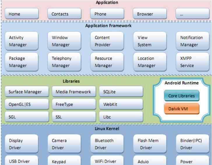 Boot Loader:这是安卓系统启动前的引导程序,主要检查ram,初始化硬件参数等功能。