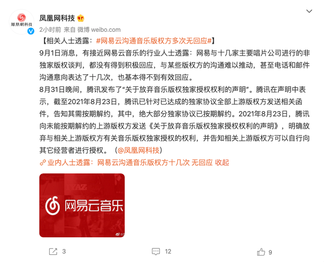 而在今天,据@凤凰网科技报道,有接近网易云音乐的行业人士透露:网易与十几家主要唱片公司进行的非独家版权谈判,都没有得到积极回应,与某些版权方的沟通难以推动,甚至电话和邮件沟通意向表达了十几次,也基本得不到有效回应。