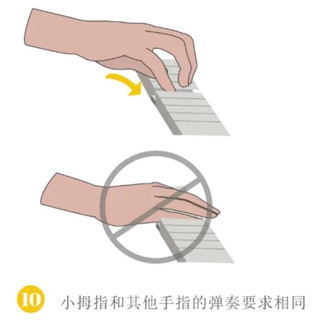 弹琴时只需要大拇指保持笔直,抬起落下即可。要注意大拇指触键的位置要在侧面边缘,靠近手指尖的部位;
