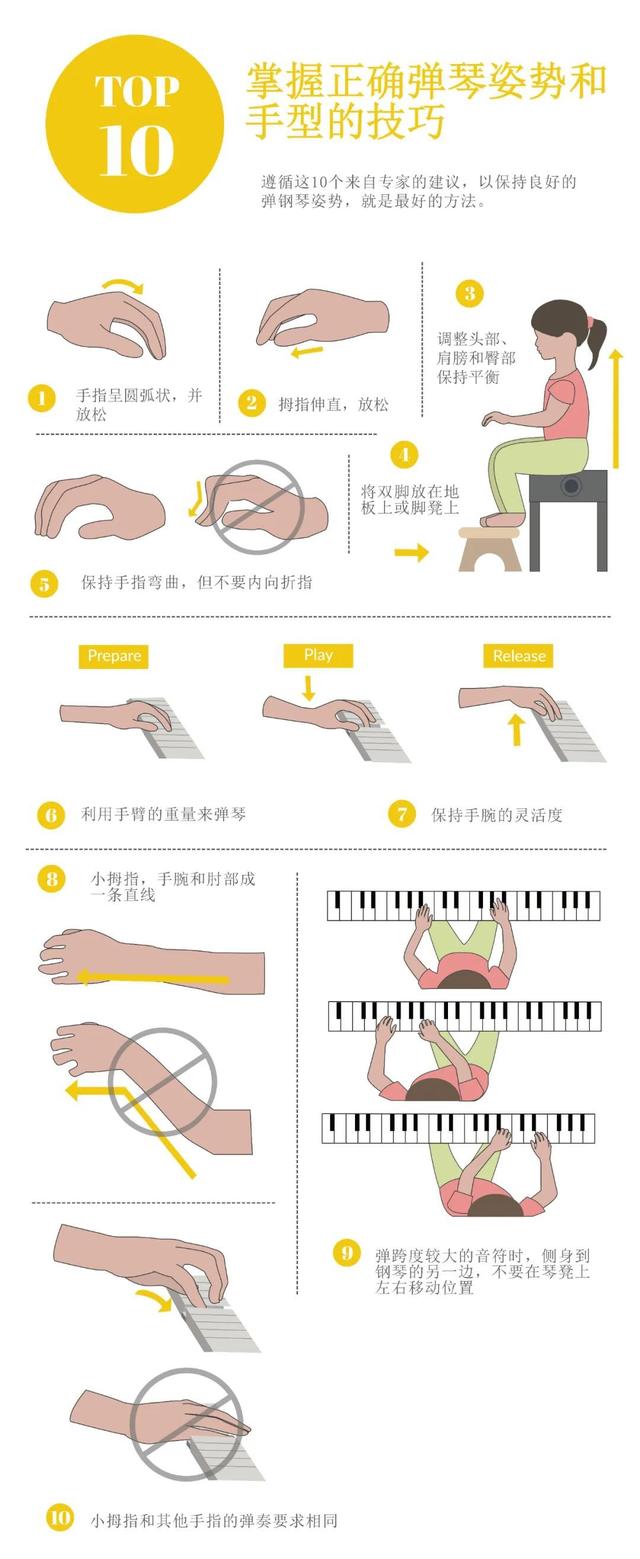 所有琴童都知道,手型是非常重要的。然而很多琴童弹琴时只看手型,其他完全置之不理。今天我们就用一张图告诉大家,弹琴的时候还需要注意哪些细节。遵循以下10条来自专家的建议,才能掌握正确的练琴姿势,使效率加倍!