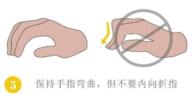 折指可以说是众多手型问题中的一大忌,在弹琴时应该保持指关节弯曲,不应该向内弯曲。每弹响一个音符,都要用指尖发力,而不是指腹;