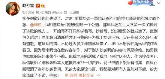 赵兮雪发的长文道歉声明里说自己一开始并不值得怎么写诗歌,只能是学者写,抄着写,她承认抄袭,并没有想到后果就发表了,也没想到就得了文学大奖,有网友对比了诗词,发现竟然抄了陈粒八首歌的歌词。