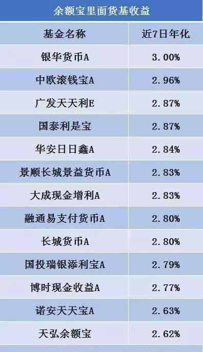 最近余额宝在低收入的道路上越走越远。目前余额宝停靠的几种商品收入基本在3%以下,其中最高的银华币A 7日年化收入仅为2.99%,余额宝收入仅为2.62%。