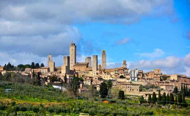 从佛罗伦萨一路向南,车辆沿着高速公路行驶。远远望去,可以看到古城墙环绕的不同高度的塔楼。它们傲然屹立在天空之下空,相当壮观。这些塔的历史最早可以追溯到公元1100年左右。意大利很多城市都有造塔的传统。控制城市的贵族家庭为了炫耀自己的财力,会比较造塔,塔造高的会比较有钱。同时这些风格粗犷厚重的城楼也是家族的防御工事,可以居高临下监视敌人,加强防御。在这座城市的顶峰,最多有72座塔(最初是75座),有“百塔之城”的美称。两个最有权势的家族费尽心思修建了这座塔,邻居不允许在附近修建任何建筑。这无疑导致了土地的浪费,直到政府出面,下令任何建筑不得超过54米高的宫(Palazzo Comunale),这场“堆码战”才平息下来。