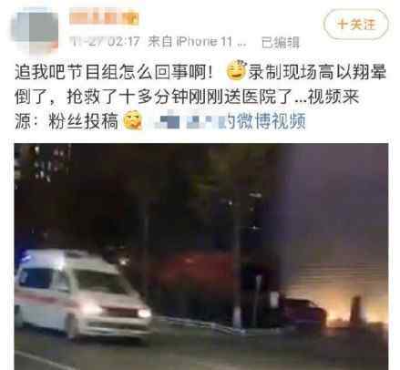 11月27日凌晨,有网友爆料,演员高以翔在录制《追我》节目时晕倒,经现场抢救后被救护车送往医院。一些记者联系了节目组和高以翔的工作人员,但没有收到回复。