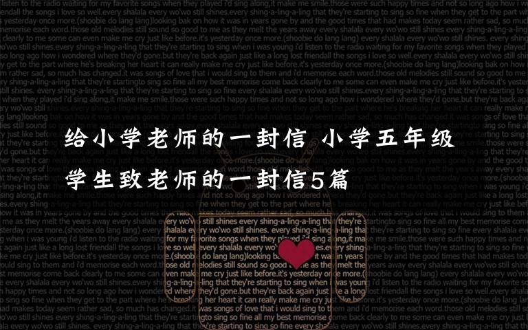 2.《给小学老师的一封信 小学五年级学生致老师的一封信5篇》仅供读者参考,本网站未对该内容进行证实,对其原创性、真实性、完整性、及时性不作任何保证。
