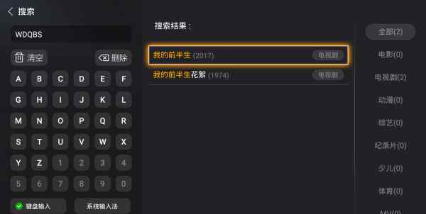 安装已成功打开。直接在搜索框里搜索《我的前半生》第一个字母“WDQBS”观看。