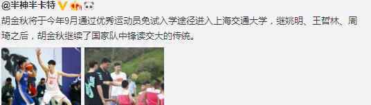 据某知名体育博主透露的消息,胡金秋将于今年9月通过优秀运动员免试入学途径进入上海交通大学。