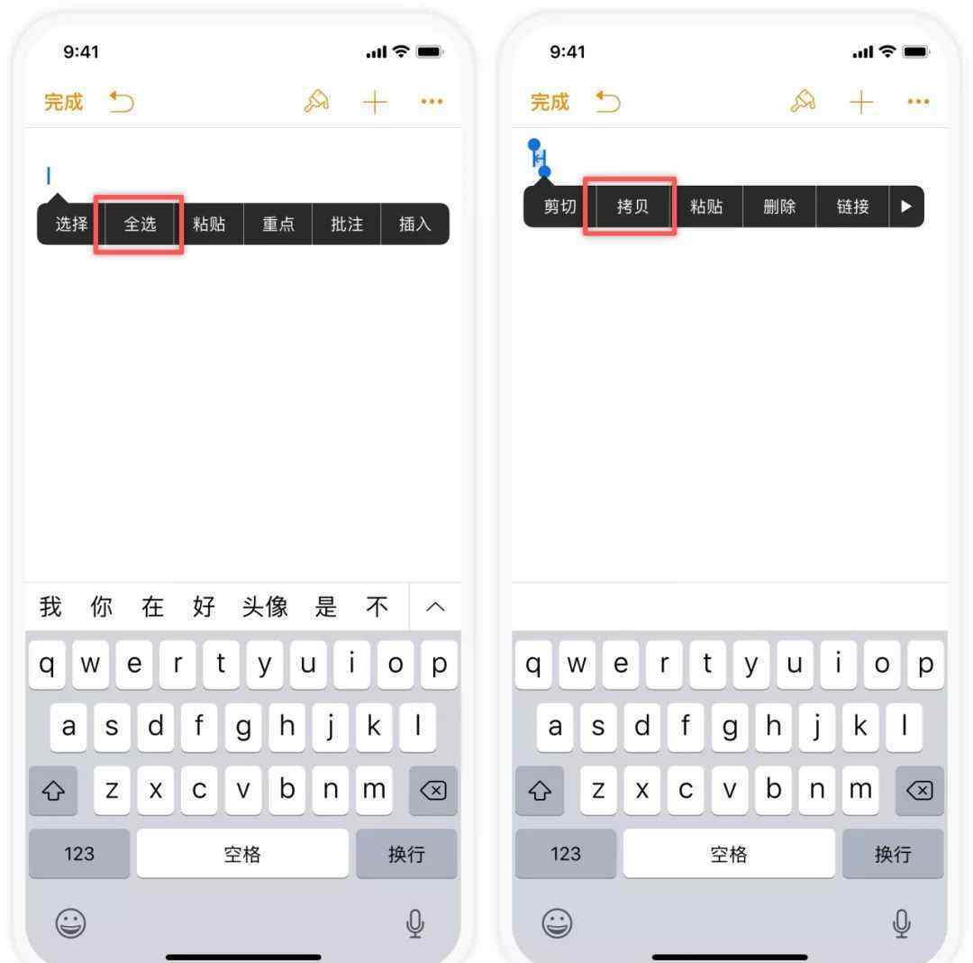 3.按住换行符,在弹出菜单中点击“全选”,然后点击“复制”复制“新的换行符”,如图: