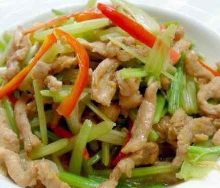 将猪肉切丝,码上盐,山芋粉,酱油。用手抓匀。(第一步:这个粉也可用生粉,须注意的是,放入粉时,要分3次放入,每一次都不要太多,每一次都要把粉抓匀,这样肉丝才会嫩,好吃。)芹菜切段。(第二步:切之前要把芹菜用刀面拍一下,这样破坏了的芹菜纤维,吃起来,芹菜那就很好咬了。)锅内坐油,见热倒入肉丝,大火爆炒。见快要熟时,将肉丝装起。(第三步:肉丝保持8分熟,不然10分熟再和芹菜汇合时,肉就没那么嫩了。)另起油锅,倒入芹菜快炒,闻见香味,再倒如肉丝,翻炒片刻,使芹菜肉丝的味道融合后。关火,撒入切好的红辣椒丝,装盘即可芹菜叶蛋花汤