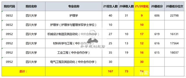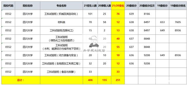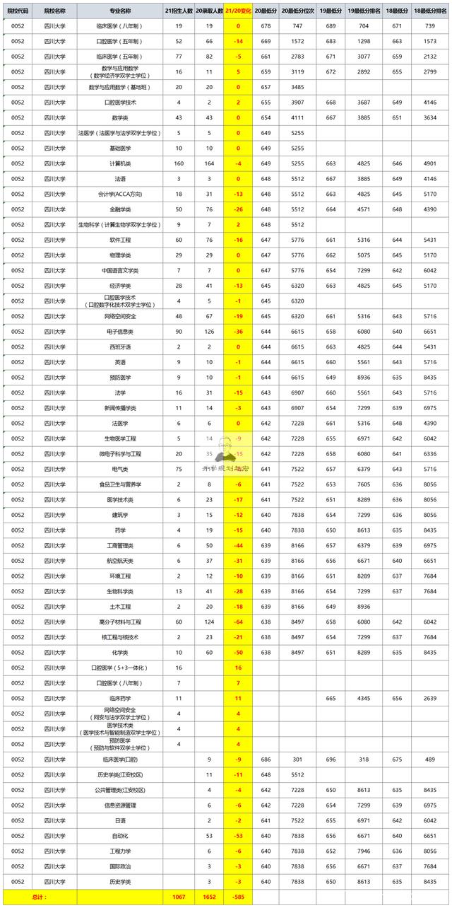 2021年四川高考的招生人数进行了统计,除了提前批的人数减少比较多以外,本科批的变化并不大,也说不上扩招的情况;但是个别的院校招生计划是增加的;本文我们来看看四川大学2021年的招生计划变化,普通批次招生总共1985人,总人数增加了168人,本科批0052代码人数减少了585人,0552代码工科试验班人数增加了251人,工科试验班大部分专业都是2020年的提前批招生专业;报考要注意哈,具体看下文: