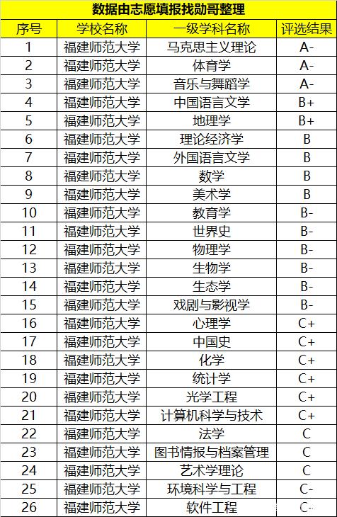 可以看到福建师范大学一共有26个学科参评,其中马克思主义理论、体育学、音乐与舞蹈学这3门学科被评为A-。
